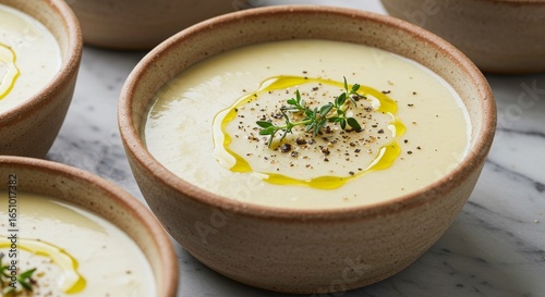 Creamy Soup in Rustic Bowls - Delicious creamy soup garnished with herbs and olive oil, served in rustic bowls. Perfect for a cozy meal