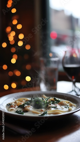 pasta, spinach, creamy, sauce, italian, food, eatery, dinner, meal, dish, delicious, italian food, dining, dinnerware, plate, food photography, hot, warm, cosy, light, christmas lights, festive, holiday, winter, wine, glasses, table, wooden table, fresh, healthy, comfort food, homemade, italian cuisine, epicure, tasty