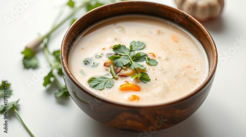 Creamy Tom Kha Gai soup served in wooden bowl, garnished with cilantro
