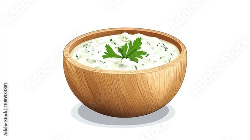 creamy, tzatziki, sauce, garnished, fresh, herb, rustic, wooden, bowl, clean, white, background, dip, mediterranean, culinary, flavorful, healthy, ingredient, yogurt, cucumber, garlic, summer, entertaining, snack, vegetarian, savoury, no people