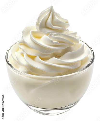 Creamy whipped topping in a glass bowl on display, cut out - stock png.