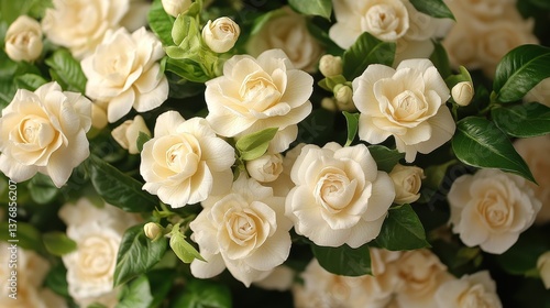 Creamy white gardenias, lush foliage, close-up, floral arrangement, wedding decor