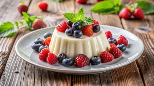 Creamy white panna cotta desserts, garnished with mixed berries and fresh mint leaves, sit atop a crisp white plate on a rustic wood background.