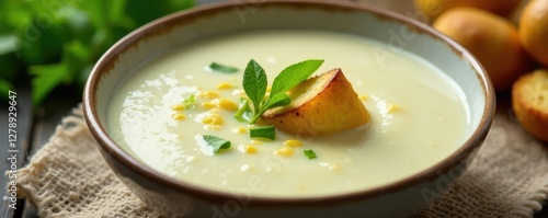 Creamy white soup in a bowl with crouton and green shoots, croutons, whitish