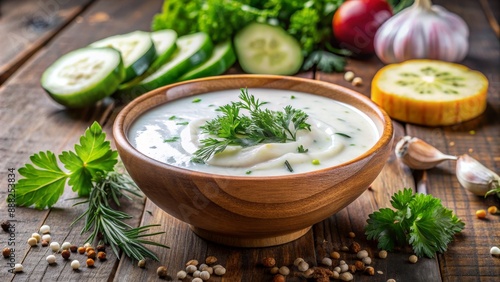 yogurt, dip, creamy, bowl, wooden, herb, cucumber, garlic, spice, greek, sauce, food, snack, healthy, fresh, green, flavorful, delicious, receipe, vegan, vegetarian, dairy, mediterranean, middle eastern, summer, party, brunch, lunch, dinner, side, dish, white, natural, homemade, rustic, simple, easy, lemony, savoury, aromatic, refreshing, light, smooth, texture, garnish, presentation, table, kitchen