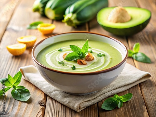Creamy Zucchini Soup in Bowl, Light Wood Table, High Depth of Field Stock Photo