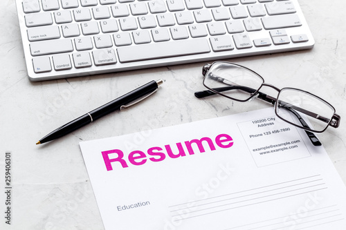 Create CV concept with pen, glasses, keyboard on white desk top view