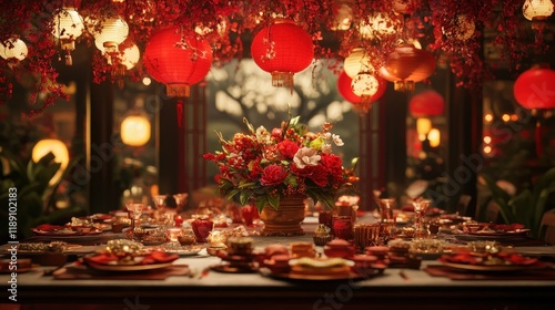 created Chinese New Year banquet table, adorned with intricate floral centerpieces, red lanterns, and traditional decorations, setting the stage for a joyful and prosperous feast.