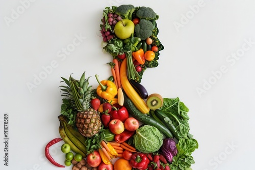 creative arrangement of fruits and vegetables forming human silhouette vibrant colors showcasing variety emphasizing nutrition and health