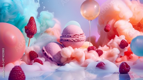 creative, dessert, scene, colourful, raspberry, whimsical, pastel, food, sweet, confectionery, artistic, playful