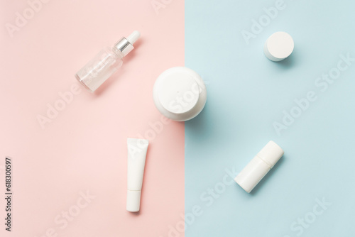 Creative flat lay of cosmetic bottles and jars on two colored background