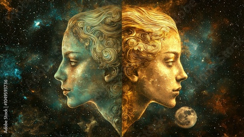 gemini, zodiac, astrology, art, creative, interpretation, star, celestial, portrait, illustration, duality, woman, face, cosmic, blue, gold, galaxy, mythology, symbolism, horoscope, fantasy, style, beauty, signs, sky, nature, feature, profile, character, expression, flow, imagination, elegance, detail, divine, energy, artistic, vibe, design, visual, representation, balance, theme, identity, universe, contrast, inspiration