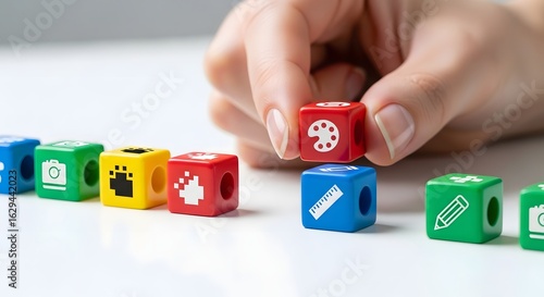 Creative process and skill development concept. A hand carefully selects and stacks colorful blocks with icons representing various hobbies and professions