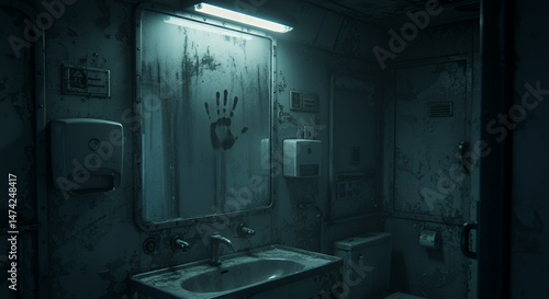 vanity, handprint, haunt, old, dirty, laundered, mirror, stain, grime, grimy, dark, desolate, gloomy, creepy, eerie, horror, thriller, science fiction, abandoned, interior, washroom, vessel, fixture, light, dispenser, surface, wall, door, tile, privies, plumbing, bathroom, decoration