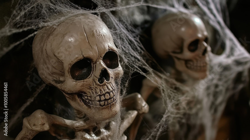 Creepy skeletons adorned with cobwebs create spooky atmosphere perfect for Halloween decorations. Their eerie expressions add to chilling ambiance of scene