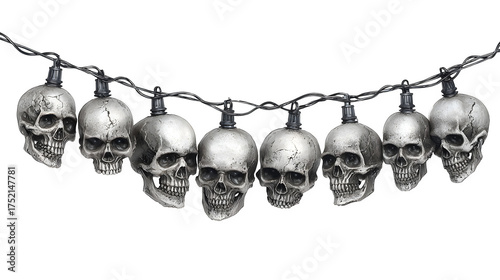 Creepy skull garland with LED glowing eyes, isolated on white background