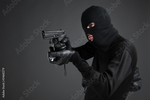 aggressive, aiming, anger, bag, balaclava, black, burglar, conspiracy, crime, criminal, danger, evil, flashlight, gun, handgun, holding, human eye, human hand, isolated, law, lifestyle, looking away, mask, man, money bag, rudeness, stealing, thief, young adult