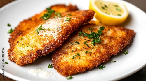 Crispy breaded chicken cutlets with parmesan and lemon garnish