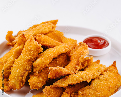 Crispy breaded chicken strips with dipping sauce