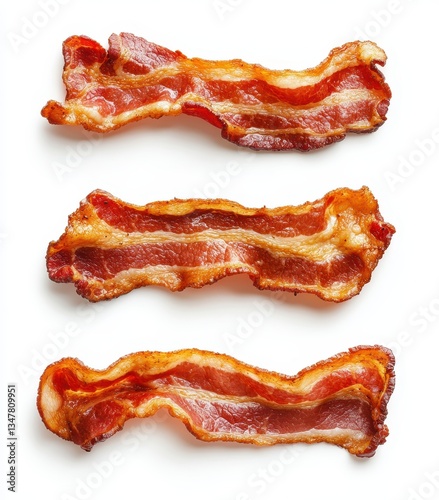 Crispy Delicious Bacon Strips Stacked on White Background Perfect for Breakfast or Culinary Presentations in Cookbooks, Menus, and Food Photography