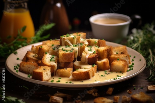 Crispy delicious juicy crispy croutons with garlic and seasoning, croutons in a plate with sauce on a dark background