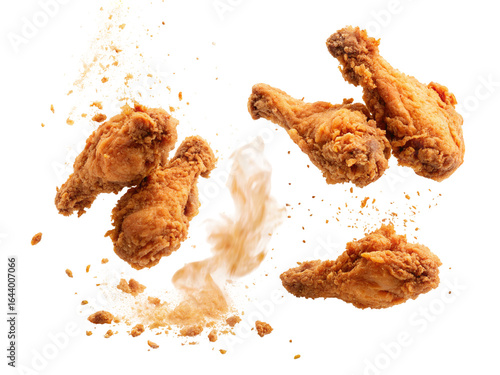 Crispy fried chicken drumsticks with flying crumbs on dark background - delicious fast food meal