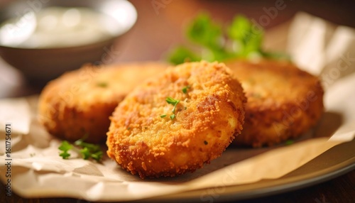 Crispy golden brown potato patties garnished with fresh green herbs on crumpled parchment paper