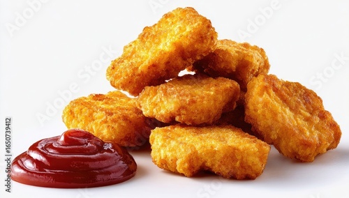 nugget, chicken, fried, food, crispy, gold, ketchup, sauce, stack, pile, snack, tasty, delicious, hot, crunchy, savoury, meal, fast, ready, eat, portion, comfort, appetising, deliciously, junk, carb, protein, dietary, pale, isolated, white, background, closeup, food photography, fast food
