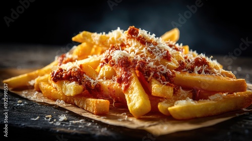 Crispy Golden French Fries Topped with Rich Marinara Sauce and Grated Cheese on Rustic Wood Background