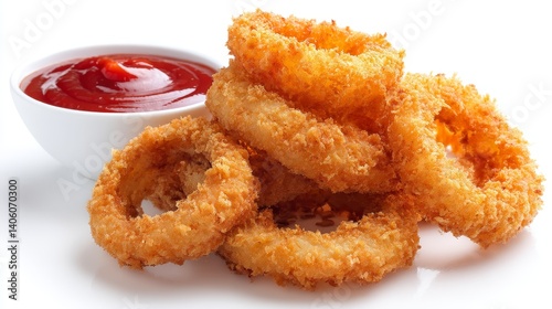 Crispy Golden Onion Rings Served with a Tangy Red Ketchup Dip Perfect for Appetizers and Snack Time Enjoyment in a Stylish Presentation