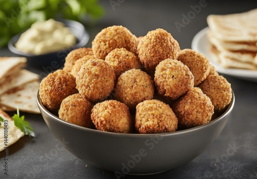 Crispy Golden-Brown Snack Bowl Filled with Flavorful Fried Balls Accompanied by Dipping Sauces and Flatbreads on a Rustic Black Background