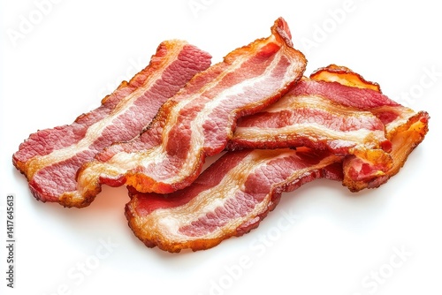 Crispy perfectly cooked bacon strips glistening with savory fat a delicious breakfast treat against a bright white background