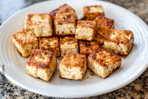 Crispy Tofu on a White Plate with Clean Lines and Natural Lighting