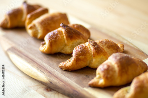 croissant, homemade fresh baked goods lies on a beautiful bamboo board on a wooden table