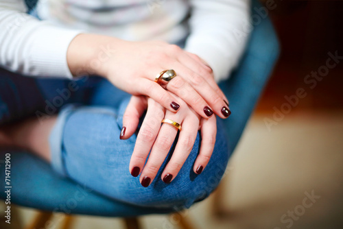 woman, manicure, style, ring, accessory, trendy, casual attire, to sit, modern, show, clothes, contemporary, jewellery, outfit, gold, hand, female, posture, colourful, design, colours, creative, pose, cosmetic, individuality, chic, denim, fancy, simple, touch, lifestyle, relax, rest, shiny, demonstrate, wear, cool, carefree, trend, appearance, crop, faceless, anonymous, unrecognizable, from above, soft focus, blur, armchair, jean