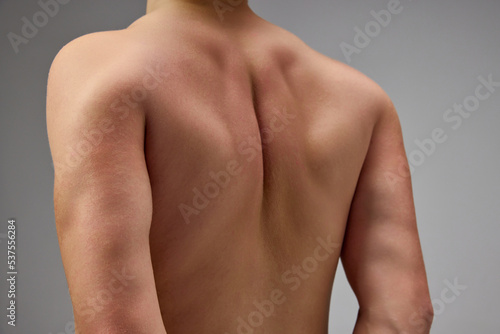 Cropped image of male muscular back. Model posing shirtless isolated over grey studio background. Pains in back, spine.