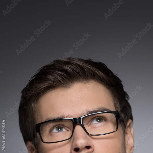 20s, brown hair, caucasian, closeup, frustration, goggles, photogenic, horizontal, human face, isolated, lifestyle, looking up, man, part of, pensive, studio shot, thinking, young adult