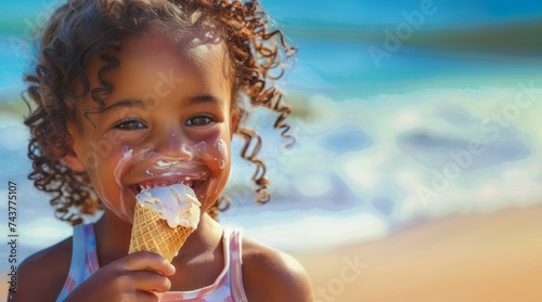 Cropped of Adorable little african american girl eating ice cream at summer beach
