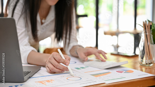 Cropped, Professional Asian businesswoman analysing and working on the report.