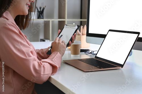 Cropped shot businesswoman holding clipboard and working with laptop at office.