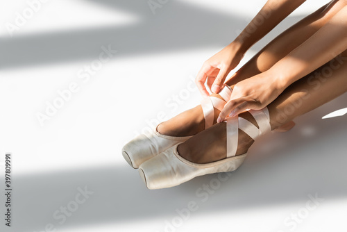 white, studio, elegance, young, adult, hand, to sit, leg, woman, performance, dance, floor, grace, ballerina, ballet, dancer, graceful, partial, cropped, copy space, one person, black woman, african american