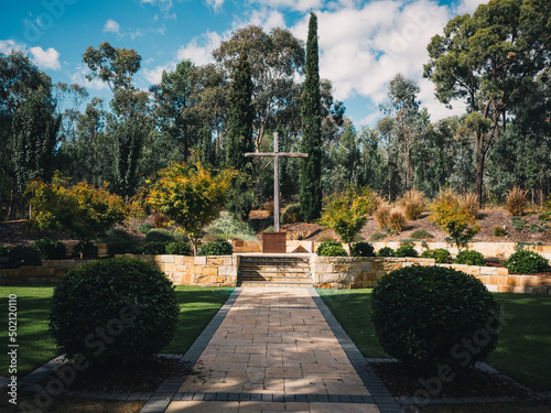 garden, park, cross, tree, nature, statue, landscape, historical building, water, stone, sculpture, sky, travel, city, summer, art, grass, path, old, outdoors, history, building, ancient