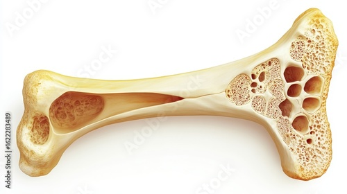 Cross section of the end of a human leg bone with bone marrow, realistic scientific illustration style, on a white background