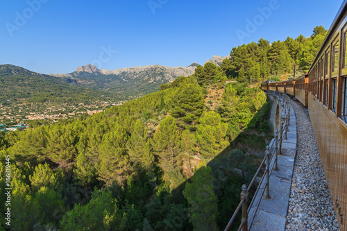 Crossing a viaduct on board a train between Soller and Palma with views over the village of Soller and the mountains range of the Serra de Tramuntana, Majorca Balearic Islands