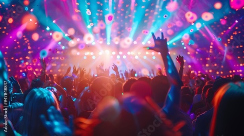 Crowd at a rave with bokeh lights and neon colors, beautiful mind visuals
