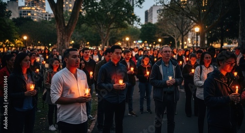 vigil, candle, crowd, night, park, remembrance, light, people, gathering, outdoors, community, memorial, sombre, sorrowful, hope, support, empathy, oneness, togetherness, concentration, illuminated, dim, dusk, evening, solemn, contemplation, mourning, grief, remember, tree, grass, urban, city, skyline, anonymous, diverse, face, sharpened, respect, silence, quiet, peaceful, moment, solemnity, shared, collective