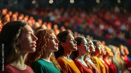 audience, concert, crowd, event, festival, gathering, group, music, people, performance, spectator, stadium, watching, woman, young, happy, excited, smiling, attentive, curious, looking up, sharpened, anticipation, dark, lighting, stage, light, spotlight, blurry, background, bokeh