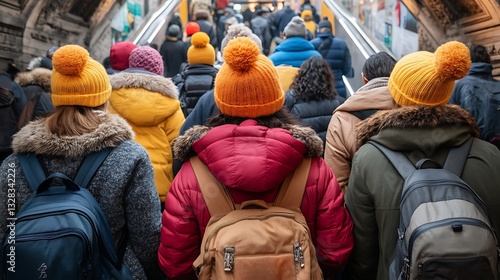 people, crowd, escalator, descending, commuter, transportation, urban, city, travel, winter, hat, jacket, backpack, public, transit, movement, tied-up, rush, hours, stair, paseo, upward, downward, yellow, orange, red, purple, many, group, together, walking, going, pathway, subway, underground, station, indoor, architecture, anonymous, individual, society, masses, multitude