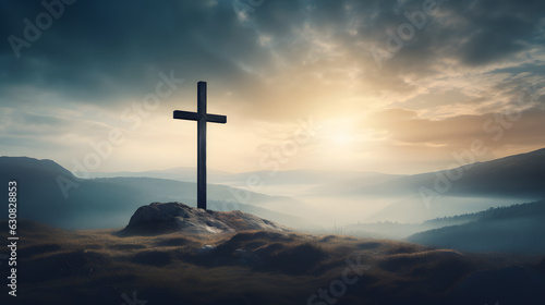 Crucifixion and Resurrection of Jesus at sunrise on the cliffs and mountains