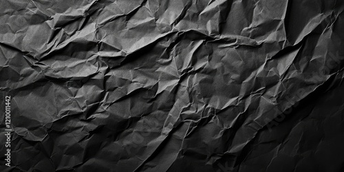 Crumpled black paper texture with deep shadows and highlights creating a grunge effect ideal for background use in design projects.